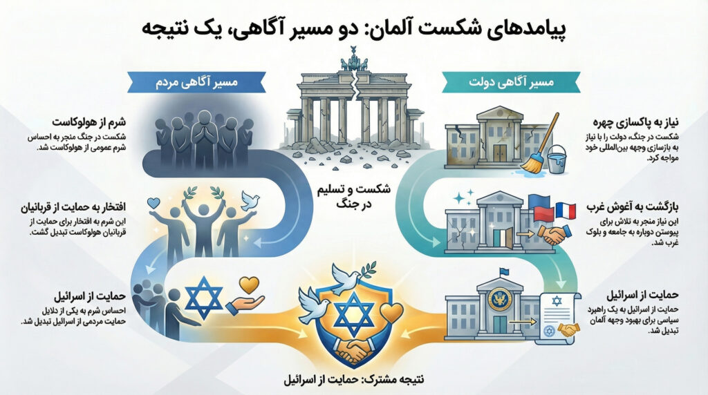 این عبارت پایانی به‌خوبی بر ماهیتِ مصالح عالیهٔ آلمان پرتو می‌افکند. برای درک این مصالح، باید به یاد آوریم که ما در جهان بعد از جنگ جهانی دوم زندگی می‌کنیم؛ جهانی که در آن آلمان جنگ علیه اروپا را آغاز کرد و با تسلیم بی‌قیدوشرط، بازندهٔ آن شد. متفقین آلمان را چهار سال اشغال و سپس به دو کشور تقسیم کردند تا فرآیند «نازی‌زدایی» (Denazification) را آغاز کنند. آلمان برای آنکه چهرهٔ جنایتکارانهٔ خود را پاک کند و به آغوش غرب بازگردد، باید وفاداری‌اش را ثابت می‌کرد؛ و چه راهی بهتر از حمایت از دولت اسرائیل، یعنی سرنیزهٔ استعمار غرب در خاورمیانه؟